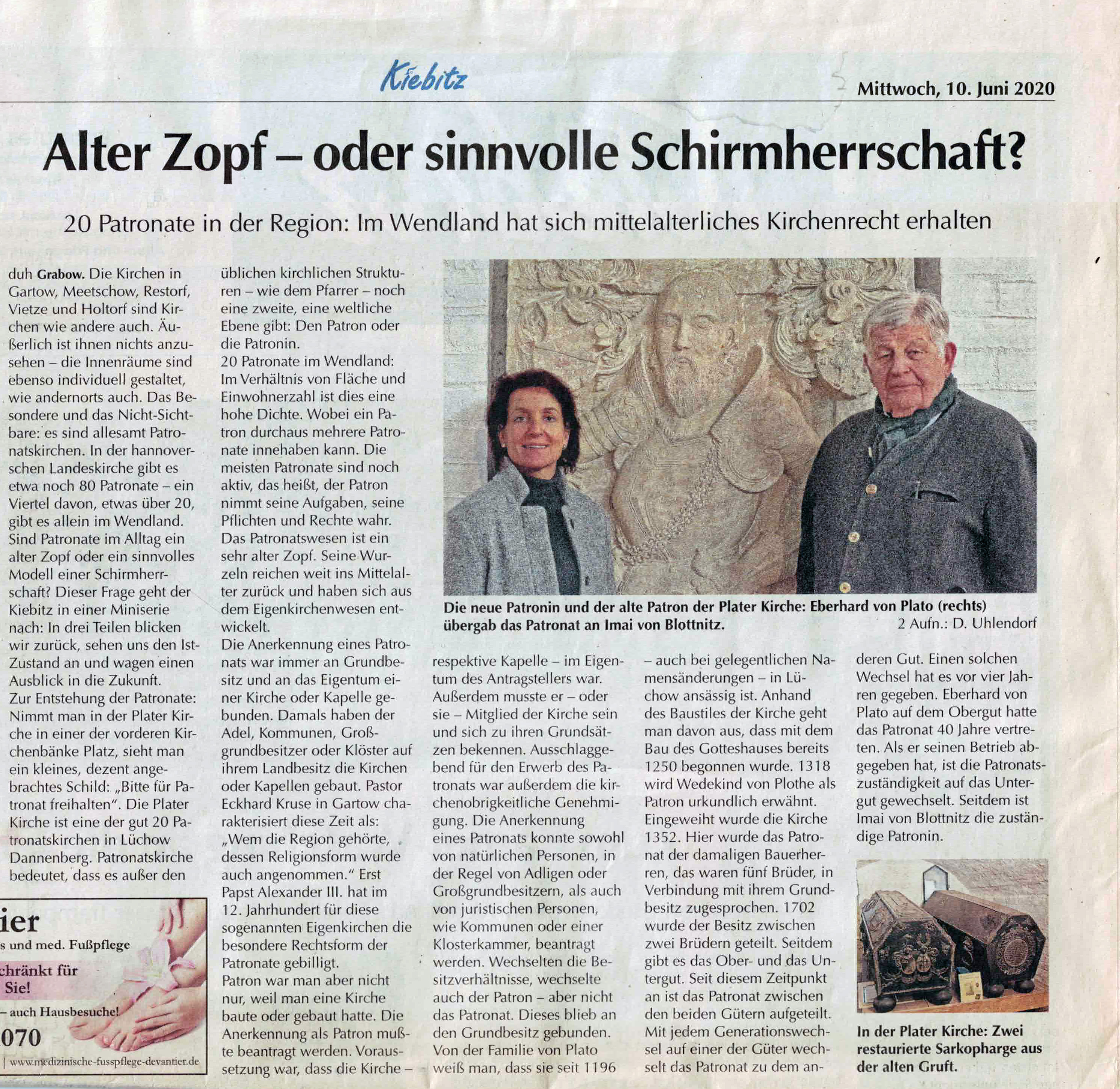 Bericht von der Patronatsübergabe, EJZ vom 21. Mai 2016 und Beitrag über Patronate in der Region, Kiebitz vom 19. Juni 2020